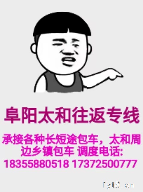 《阜太专线车队》阜阳~太和往返豪华轿车专线车队,阜城唯一一支的专业车队。解除每位乘客旅途乏味,疲劳的传统乘车理念。专为时尚及商务人士打造。因为用心。所以专业。安全!方便!快捷!以客户为中心!每天24小时!随叫随到!每天循环发车!全程高速!承接全国包车服务!周边乡镇等!阜阳太和城区调度 合肥等 18355880518 17372500777 敬请保留 以备急用 常年有效 安全第一