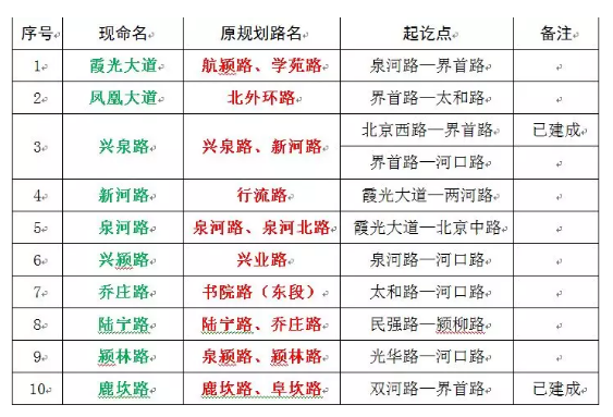 颍河与泉河之间的地区为泉北片区,共命名道路52条,其中,对10个原规划路名进行调整。