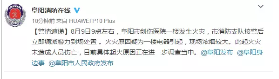 8月9日9点左右,阜阳市创伤医院一楼发生火灾,市消防支队接警后立即调派警力到场处置 。火灾原因疑为一楼电器引起,现场浓烟较大。此起火灾未造成人员伤亡,目前具体起火原因正在进一步调查当中。火灾原因疑为一楼电器引起。此起火灾未造成人员伤亡,目前具体起火原因正在进一步调查当中。