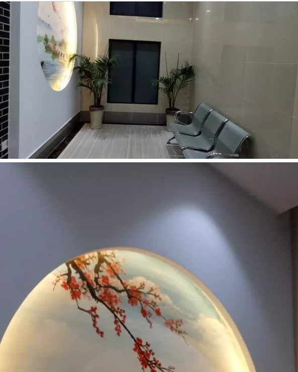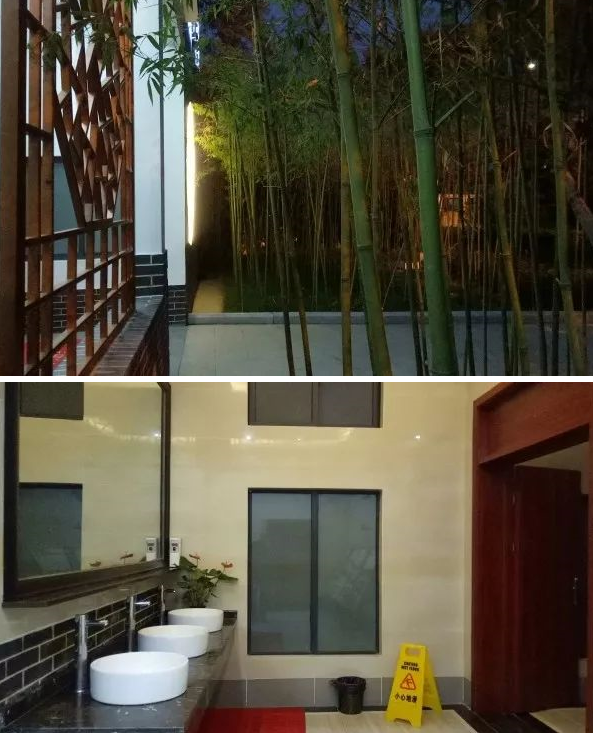 在傍晚的灯光的映照下,正面前有一排竹子,有风吹过,发出轻微的婆娑声。(厕所外墙)(正面的一排竹子)(洗手台)进门正中,设计有坐椅,摆放两盆绿植,顶上光线柔和,显得安静又温暖。